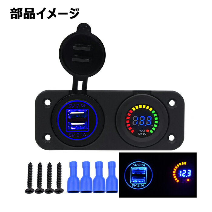 製品仕様 2ポートUSBソケットチャージャー 高品質USB充電器、12V出力電源 入力電源:DC 12V USBソケット出力:DC 5V 2.1A 材質:PC不燃材質 電圧測定範囲: 9-15V 11.3V-11.9V赤ランプ 12.0V-12.5V黄色ランプ 12.6V-15V緑ランプ 重量:70g パッケージ内容: DCデジタル電圧計チャージャー ターミナルコネクタ ネジ 【注意事項】 ※日本語取扱説明書は付属しておりません。
